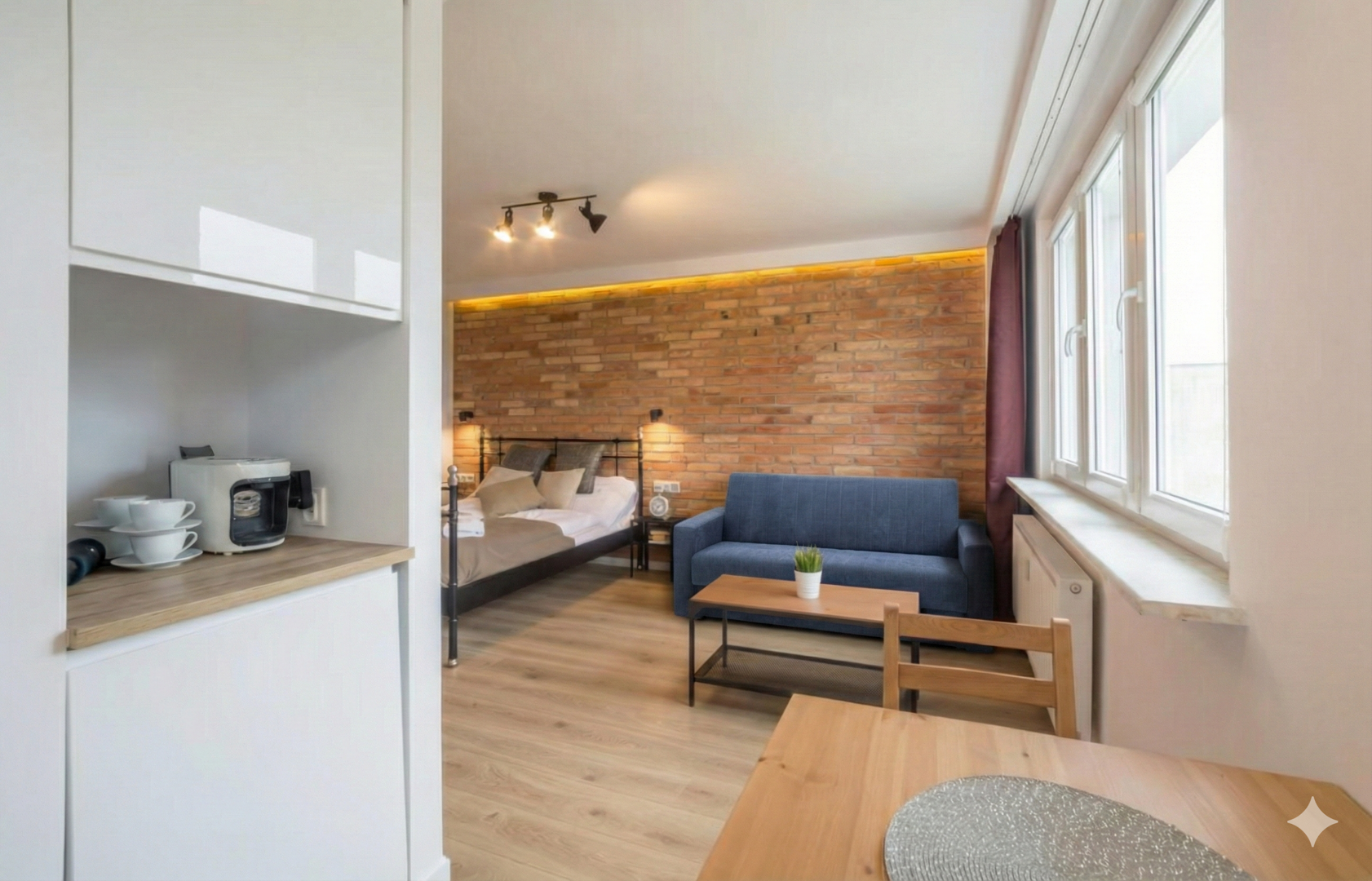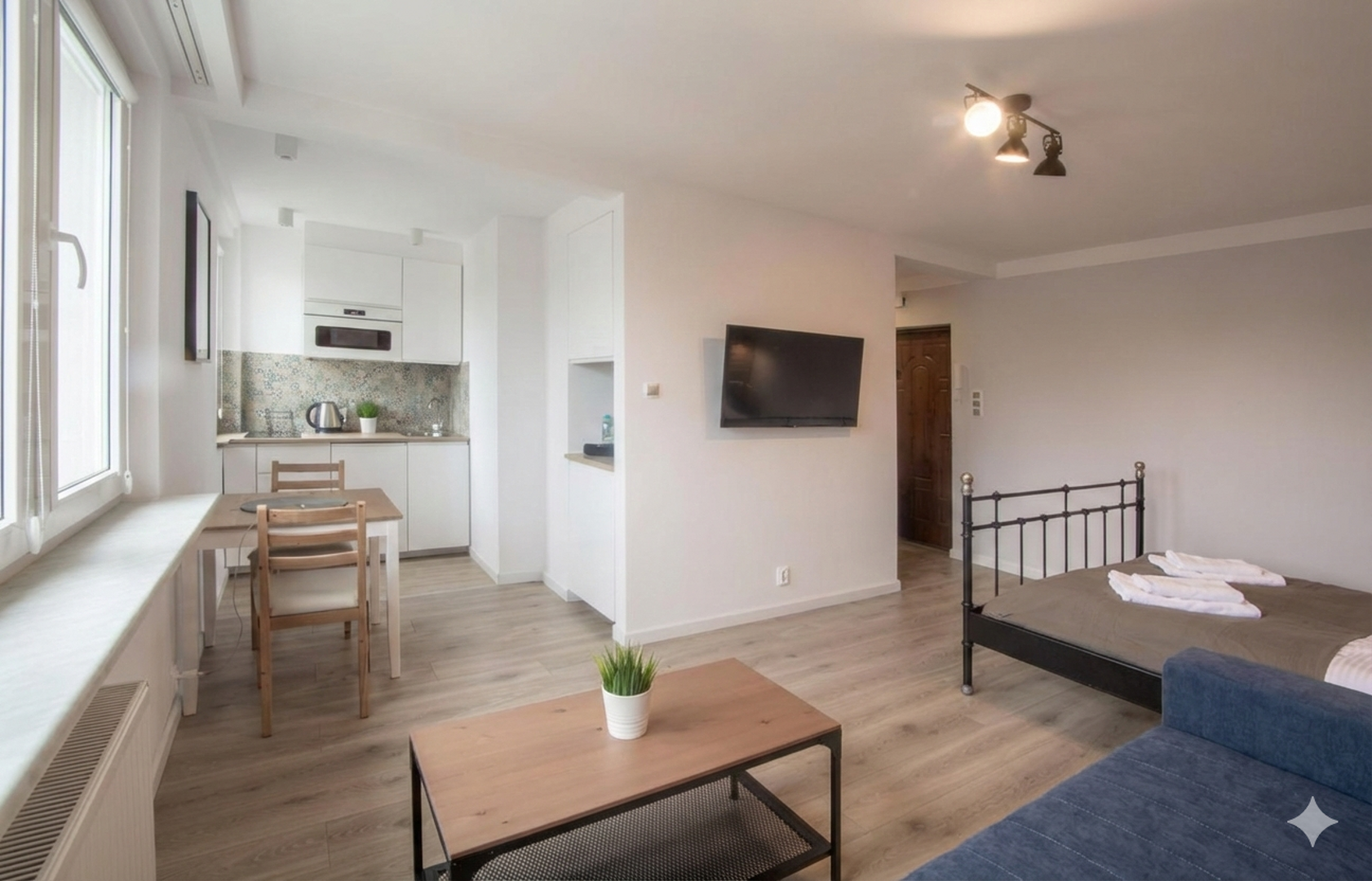 Naszym gościom oferujemy apartament na czwartym piętrze o powierzchni 27m2 (budynek bez windy). Kawalerka składa się z sypialni, prywatnej łazienki i aneksu kuchennego z częścią jadalną. W apartamencie mogą wypocząć wygodnie nawet 4 osoby dorosłe. Goście wygodnie wyśpią się w części sypialnej na dużym podwójnym łóżku (160x200), dzieci mogą skorzystać z rozkładanej sofy o wymiarach 140x200cm. Dodatkowo w apartamencie znajduje się stół jadalniany, przy którym mogą usiąść 4 osoby. Ponadto w skład mieszkania wchodzi łazienka z prysznicem, kuchnia wyposażona w zmywarkę, lodówkę z zamrażarką i płytę kuchenną. Z okien rozpościera się piękny widok na sopockie lasy i dachy okolicznych budynków.